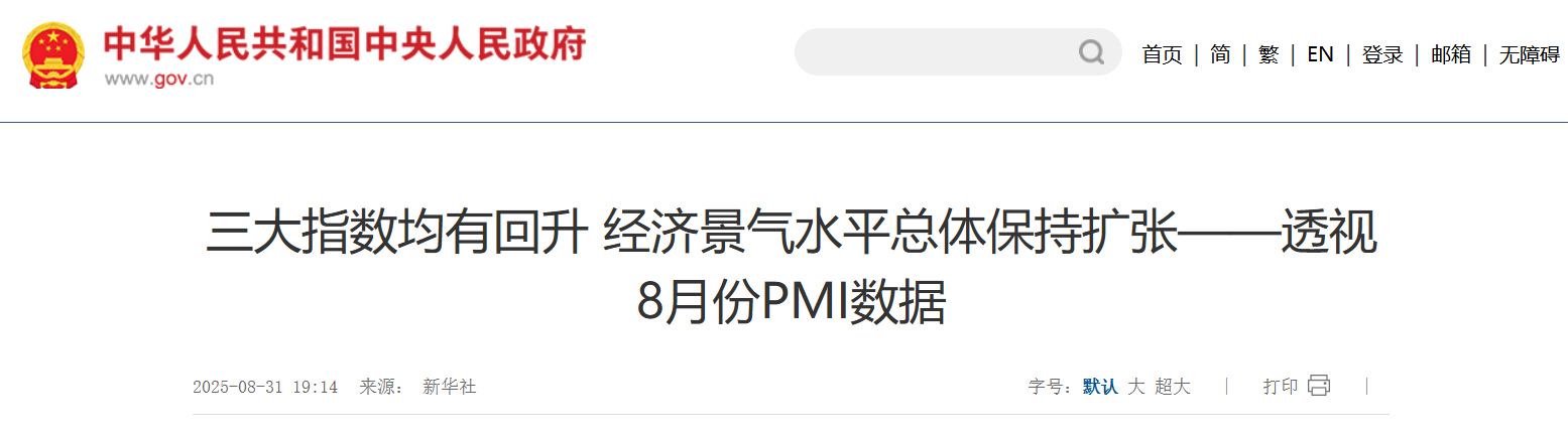《三大指数均有回升 经济景气水平总体保持扩张——透视8月份PMI数据》(转自中国政府网)