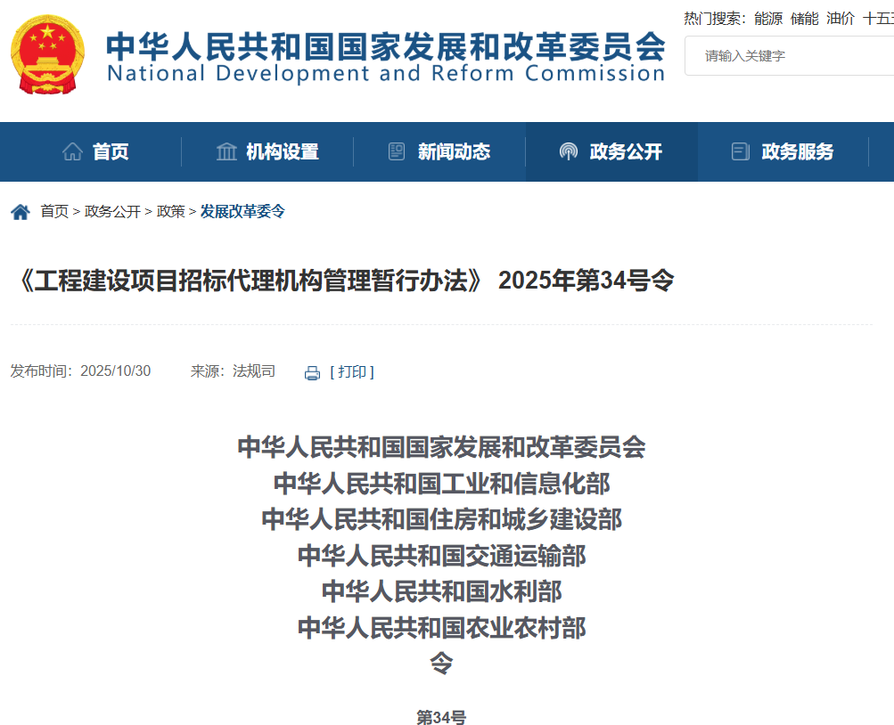 《工程建设项目招标代理机构管理暂行办法》已经2025年9月26日第23次国家发展改革委委务会议审议通过和工业和信息化部、住房城乡建设部、交通运输部、水利部、农业农村部审签,现予公布,自2026年1月1日起施行。